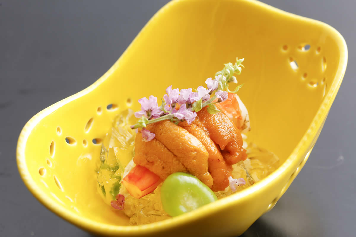 도미는 천연 토종만을 사용. 동해의 거센 파도에 휩쓸 천연 참돔은 몸이 잘 잠그고 맛도 꽉 응축 된 최고급의 맛입니다. 현지의 진간장과 민속주를 사용하여 1 시간 이상에 걸쳐 차분히 맛을 확인하면서 광택이 나올 때까지 끓입니다. 당관 자랑의 도미의 투구 조림을 꼭 맛보세요.