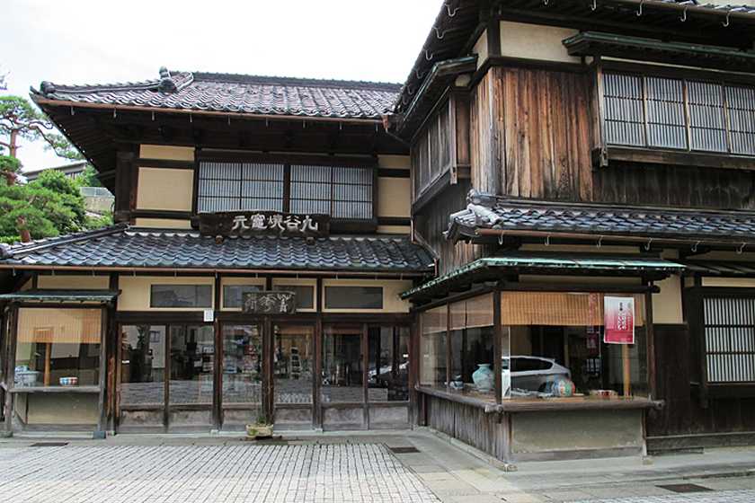 다이쇼 시대의 드문 예술가, 北大路魯山人가 가가의 미식과 구타 니 야키를 만나 도자기 제작의 초보를받은 것이 이곳의 초대. 간판은 산진의 손에 의한 것.